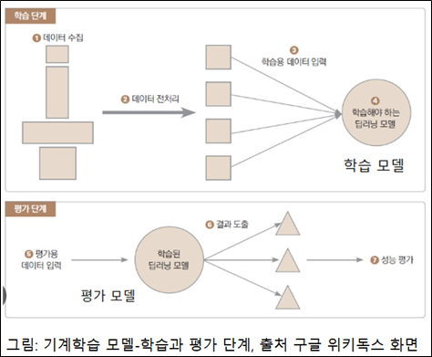 AI(Artificial Intelligence)는 학습을 시켜서 기억을 하고, 기억 한 것을 사용하여 답변을 하게 만듭니다. 이런 학습은 기계 학습(Machine Learning) 입니다. 기계 학습은 학습 모델을 만들어 학습 알고리즘을 사용하여 계속 반복적인 학습을 시킵니다. 그림으로 설명합니다.