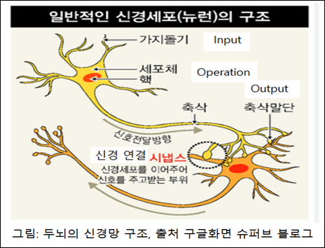 심층 학습은 인간의 두뇌 신경망이 작동하는 것을 본 따서 기계 학습을 시키는 것을 말합니다. 인간의 생각, 추론, 학습, 기억과 언어 지능은 두뇌 신경망을 통하여 약한 전기 신호와 화학물질 신호를 통하여 이루어 집니다. 그림으로 살펴 봅니다.