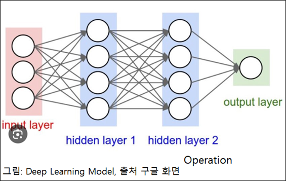 이와 같은 원리로 인공신경망을 만들어서 심층 학습을 시킵니다. 입력 층(Input layer), 다수의 은닉 층(Hidden layer)과 출력 층(Output layer)으로 구성된 인공 신경망 Deep Learning Model에 의하여 학습을 시킵니다.