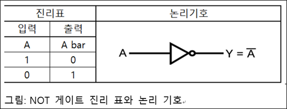 불 대수 *A와 A bar 연산(A=1 A bar=0)*을 논리 회로에 적용합니다. 이런 논리를 처리하는 게이트를 NOT 게이트(부정 논리) 이라고 합니다. NOT 게이트 진리 표와 논리 부호를 그림으로 설명합니다.