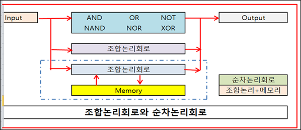 조합 논리 회로는 각종 연산을 하고, 순차 논리 회로는 Memory에 저장된 명령어와 데이터를 불러와서 연산을 합니다.