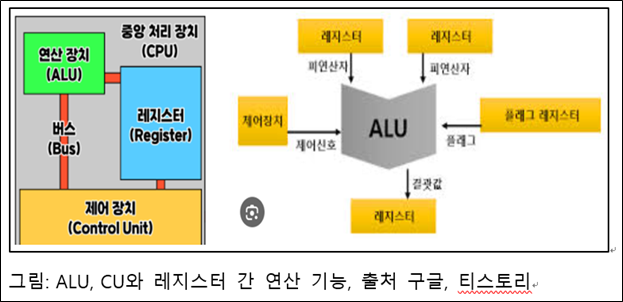 CPU는 산술&연산 장치(Arithmetic & Logic Unit, ALU)와 제어 장치(Control Unit, CU)로 구성 됩니다. ALU는 연산(논리 처리와 계산 기능, Operation)을 담당하고, CU는 ALU에게 명령어로 지시하여 작동하게 합니다. 컴퓨터의 ALU와 CU로 구성된 CPU가 핵심 장치 입니다.