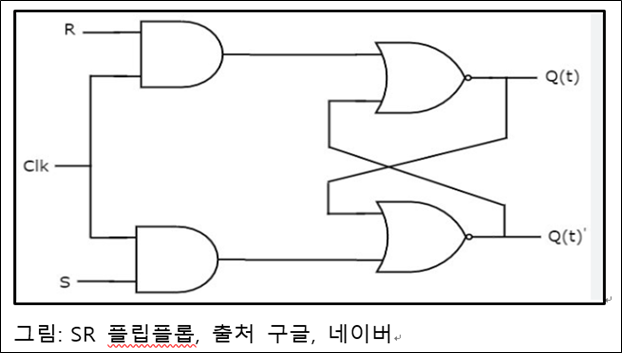 플립 플롭의 Clk(Clock) 기능으로 Bit 0과 Bit 1을 생성 시키고, Set 기능으로 Q(t)에 데이터를 저장 시킵니다. 또한 Reset 기능으로 Q(t)’에 보수(Complement)를 저장 시킵니다. 이런 FF를 SR Flip Flop이라고합니다.