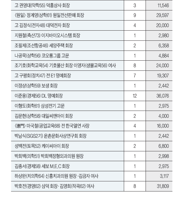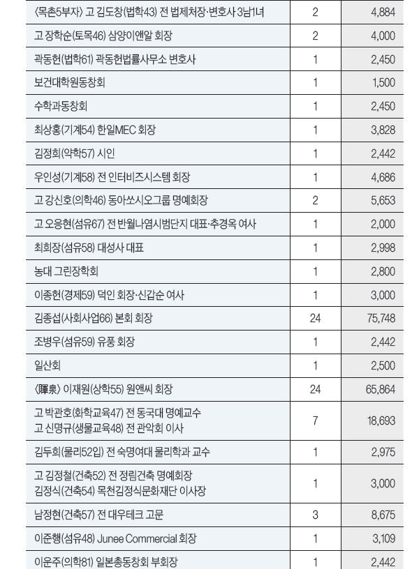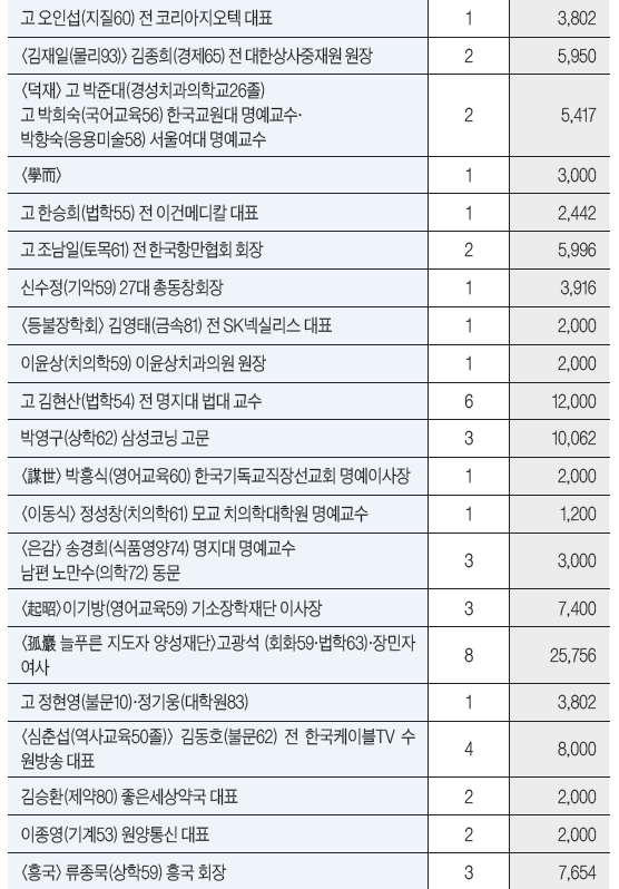 기부자들은 직접 단상에 올라 장학증서를 수여하며 후배들과 마주했다. 홍상욱(원예83) 상산학원 이사장, 정홍일(경영05) 홍인 대표, 정충시(화학72) 세진에이엠 대표, 윤철종(보건87) 보건대학원동창회 부회장, 조기호(화학교육54) 기호물산 회장과 부인 이영자(생물교육56) 동문, 성백전(토목52) 케이씨아이 회장, 박호전(경영62) 삼덕 회장, 문현경(식품영양71) 생활과학대학 동창회장, 민수정(회화62) 미술대학 동창회 사무국장, 송경희(식품영양74) 명지대 명예교수, 이기방(영어교육59) 기소장학재단 이사장, 이종영(기계53) 원양통신 대표, 김영기(법학54) 전 롯데삼강 감사, 이도영(의학63) CM병원 이사장과 이윤경(간호65) 행정대표 등이 무대에 올라 학생들을 격려했다.