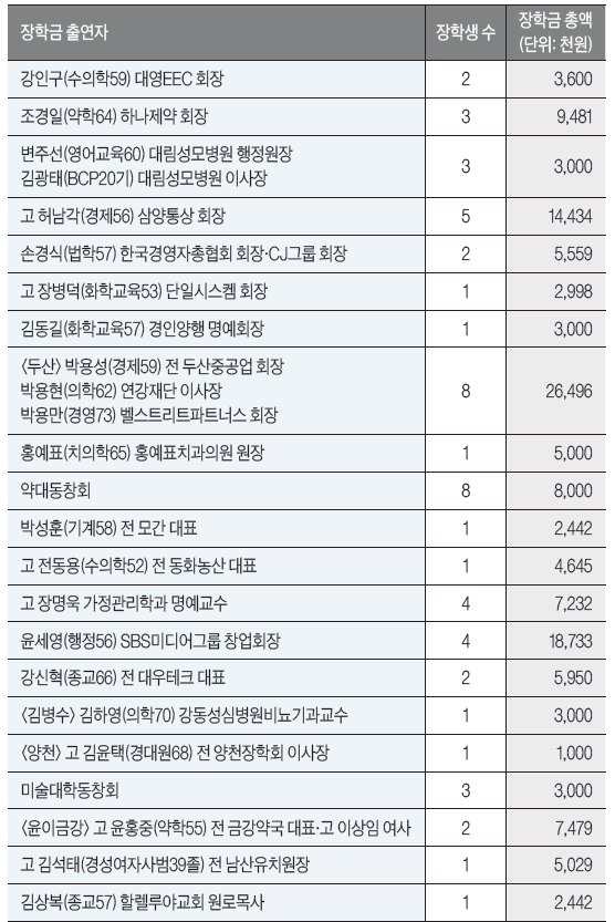 출범 초기 소규모로 시작한 장학금 사업은 지난 40여 년 간 계속 확대돼 현재 매년 1500명 이상의 학생이 혜택을 받고 있다. 마포의 장학빌딩에서 나오는 임대수익금이 밑바탕이 됐다. 단일 대학 동창회가 이처럼 안정적인 재단 수익과 기부금으로 장학 체계를 운영하는 사례는 국내에서 유례가 없다.