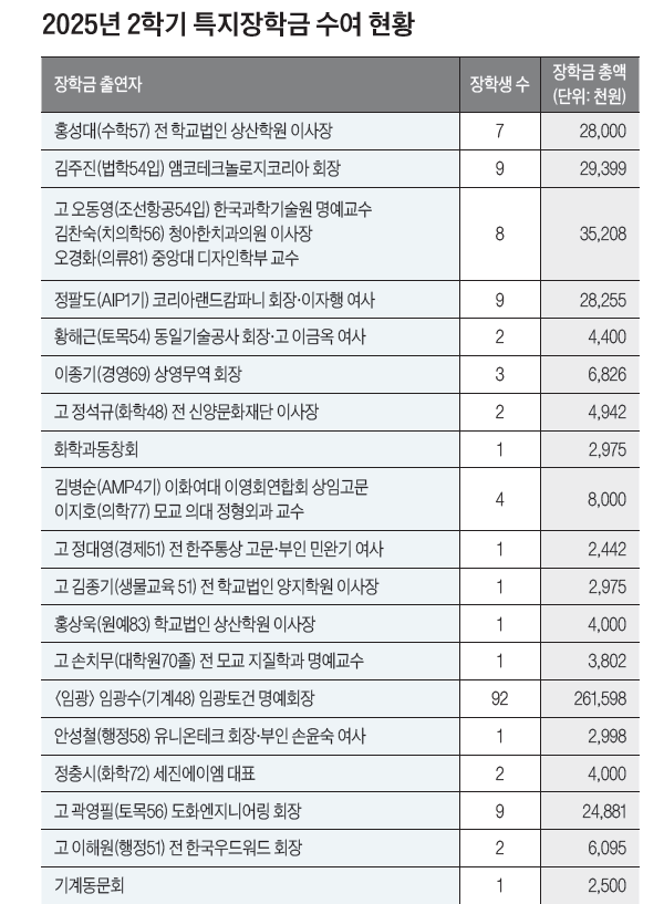 이번 학기 장학생은 학부생 632명, 석사과정 84명, 박사과정 24명, 석·박사 통합과정 31명으로 총 771명이다. 성적 우수자뿐 아니라 학생회 임원, 동아리 회장, 운동부 주장 등 교내 활동에 앞장선 재학생들도 포함됐다. 이는 장학금이 단순한 학업 성취를 넘어 공동체 활동과 리더십까지 격려하는 취지임을 보여준다. 이번 학기는 1학기보다 60여 명이 늘어나 역대 최다 인원이 장학금 혜택을 받았다.