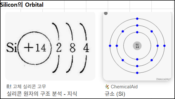 실리콘의 전자는 14로서 제 1 궤적 정수 2개, 제 2 궤적 정수 8개를 채우고, 제 3 궤적은 4개이지만 이 4개는 불안정합니다. 따라서 이웃 원자의 제 3 궤적 4개와 결합하여 정수 8 개를 만들어 안정적으로 존재 합니다. 이런 성질을 Octet Rule(8 전자 원리)이라고 합니다.