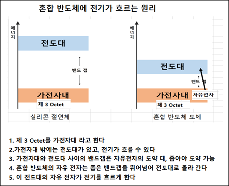 8 전자 원리로 부도체인 실리콘에 15족 인(P)을 혼합하면 전기가 통하게 됩니다. 인의 전자는 15개로서 제 1 궤적 2, 제 2 궤적 8, 제 3 궤적 5개의 전자 정수로 원자핵을 구름 회전하고 있습니다. 제3 궤적에 있는 실리콘의 4 개와 인의 5 개를 혼합하면 9(4+5=9) 개로서, 8 전자 원리를 충족하고도 1 개의 전자가 남게 됩니다.