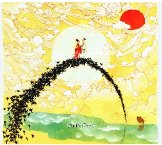 지상의 까마귀와 까치가 하늘에 올라가서, 은하수에 오작교(烏鵲橋) 다리를 놓아서