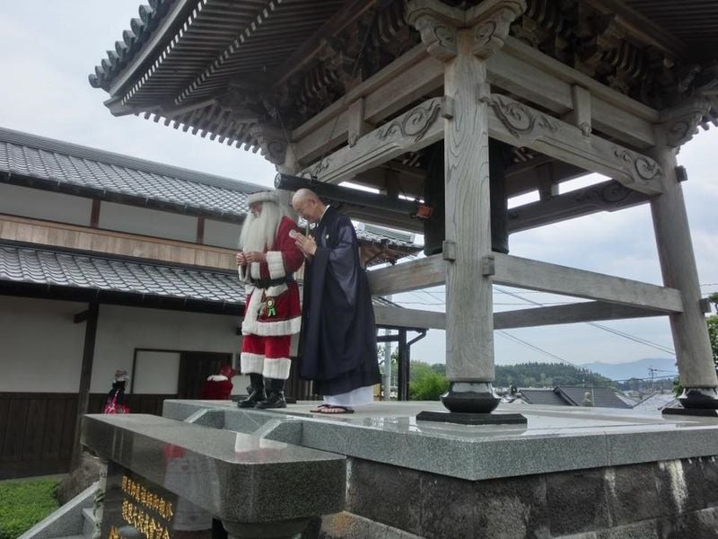 Let's be Santa Claus standing next to a Buddhist monk, as seen in the photo below.