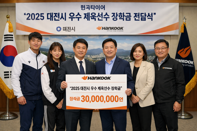 한국타이어는 12월 15일, 대전시 중구 부사동에 위치한 대전시체육회관에서 ‘2025 대전시 우수 체육선수 장학금 전달식’을 열고, 총 3천만 원의 장학금을 대전시체육회에 전달했다고 16일 밝혔다.