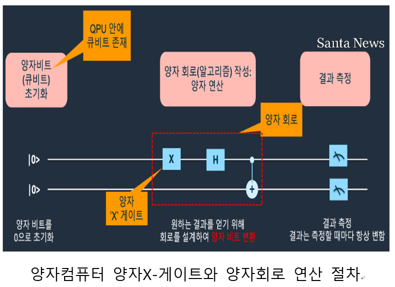 양자컴퓨터는 큐비트 0과 큐비트 1을 사용하여 양자게이트에서 논리와 산술 양자연산을 합니다.