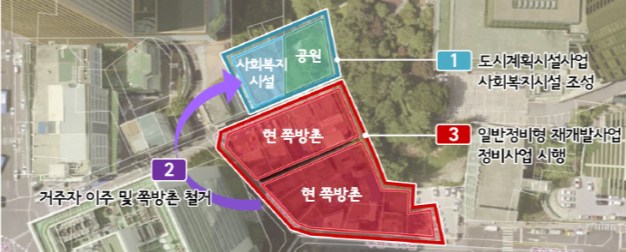 일반적으로 ‘순환정비 방식’은 추가 비용 발생과 정비기간 장기화로 사업시행자가 선호하지 않는다. 이에 서울시는 쪽방 밀집지역과 거주민들의 특수성 등을 감안해 자치구·사업시행자·전문가 등과의 수차례 논의와 쪽방 주민 의견수렴을 거쳐 사회적 약자를 고려하는 방안을 이끌어 냈다고 설명했다.